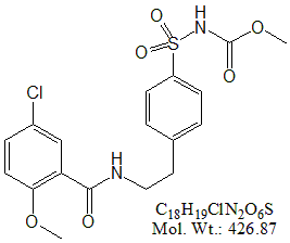 | Glyburide GLB00-100 5-Chloro-N-[2-[4-[[[(cyclohexylamino)carbonyl]amino]-sulfonyl]phenyl]ethyl]-2-methoxy-benzamide ; CAS # 10238-21-8 ; MORE INFO >> |