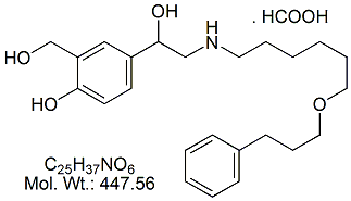 | Salmeterol EP Impurity C SAL03F-100 1-[4-Hydroxy-3-(hydroxymethyl)phenyl]-2-[[6-(3-phenylpropoxy)hexyl]amino] ethanol formate ; CAS # 94749-11-8 (base) ; MORE INFO >> |