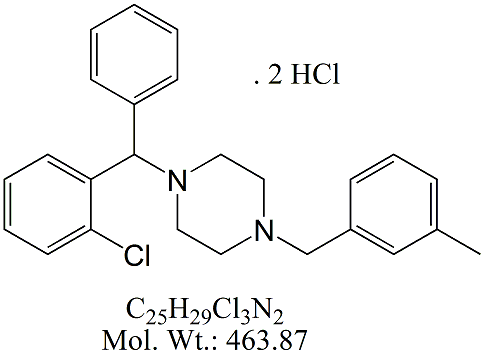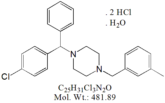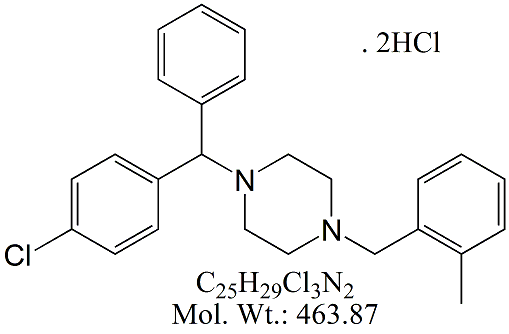 | Meclizine HCl MCL00H-100 1-[(4-Chlorophenyl)phenylmethyl]-4-[(3-methylphenyl) methyl]-piperazine dihydrochloride monohydrate ; CAS # 31884-77-2 ; MORE INFO >> |
