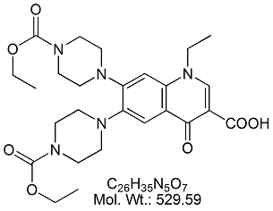 | Norfloxacin EP Impurity I NFX09-100 7-Chloro-6-[4-(ethoxycarbonyl)piperazin-1-yl]-1-ethyl-4-oxo-1,4-dihydro quinoline-3-carboxylic acid ; MORE INFO >> |