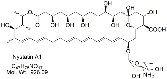 | Nystatin NST00-100MG Nystatin A1 ( > 70%) ; CAS # 34786-70-4 (A1) ; 1400-61-9 (mixture of A1, A2, A3) ; MORE INFO >> |