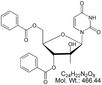| Sofosbuvir Dibenzoyl Dione Impurity SFS53-100 ((2R,3R,4S,5R)-3-(Benzoyloxy)-5-(2,4-dioxo-3,4-dihydropyrimidin-1(2H)-yl)-4-hydroxy-4-methyltetrahydrofuran-2-yl)methyl benzoate ; CAS # 944476-44-2 ; MORE INFO >> |