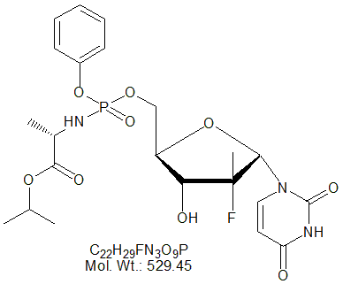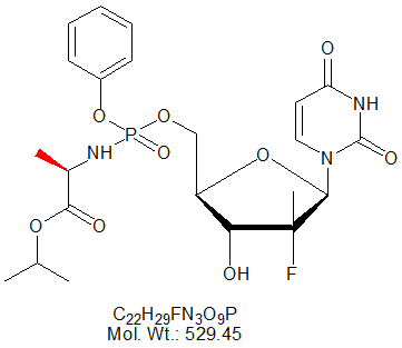 | Sofosbuvir SFS00-100 Isopropyl (2S)-2-[[[(2R,3R,4R,5R)-5-(2,4-dioxopyrimidin-1-yl)-4-fluoro-3-hydroxy-4-methyl-tetrahydrofuran-2-yl]methoxy-phenoxy-phosphoryl] amino] propanoate ; CAS # 1190307-88-0 ; MORE INFO >> |