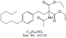 | Fingolimod N-Acetyl Diethyl Ester ;	100 MG FGL68-100 Diethyl 2-(Acetamido)-2-(2-(4-octylphenyl)ethyl)propanedioate ; CAS # 162358-08-9 ; MORE INFO >> |