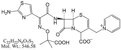 | Ceftazidime Pentahydrate CFT00H-100 1-[[(6R,7R)-7-[[(2Z)-(2-Amino-4-thiazolyl)[(1-carboxy-1-methylethoxy) imino]acetyl]amino]-2-carboxy-8-oxo-5-thia-1-azabicyclo[4.2.0]oct-2-en-3-yl]methyl]pyridinium inner salt pentahydrate ; CAS # 78439-06-2 (pentahydrate) ; 72558-82-8 (anhydrous) ; MORE INFO >> |