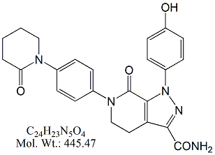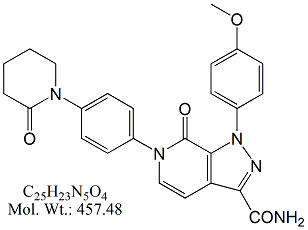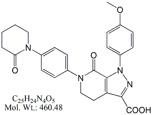 | Apixaban APX00-100 4,5,6,7-Tetrahydro-1-(4-methoxyphenyl)-7-oxo-6-[4-(2-oxo-1-piperidinyl) phenyl]-1H-pyrazolo[3,4-c]pyridine-3-carboxamide ; CAS # 503612-47-3 ; MORE INFO >> |