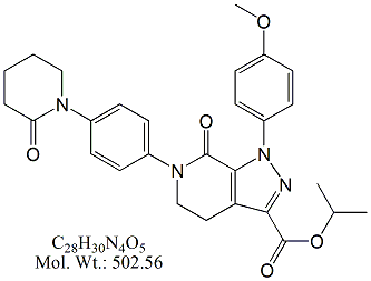 | Apixaban Isopropyl Ester Impurity ;	 100 MG APX43-100 4,5,6,7-Tetrahydro-1-(4-methoxyphenyl)-7-oxo-6-[4-(2-oxo-1-piperidinyl) phenyl]-1H-pyrazolo[3,4-c]pyridine-3-carboxylic acid isopropyl ester ; MORE INFO >> |