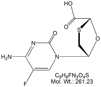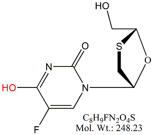 | Emtricitabine EMT00-100 4-Amino-5-fluoro-1-[(2R,5S)-2- (hydroxymethyl)-1,3-oxathiolan-5-yl]-2-(1H)-pyrimidone ; CAS # 143491-57-0 ; MORE INFO >> |