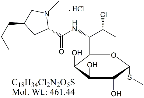 | Clindamycin HCl CMH00H-100 Methyl 7-chloro-6,7,8-trideoxy-6-[[[(2S,4R)-1-methyl-4-propylpyrrolidin-2-yl]carbonyl]amino]-1-thio-L-threo-α-D-galacto-octopyranoside hydrochloride ; CAS # 58207-19-5 (Monohydrate) ; 21462-39-5 (HCl) ; 18323-44-9 (base) ; MORE INFO >> |