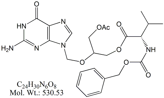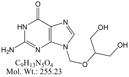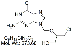 | Valganciclovir USP RC A VGC21-100 Ganciclovir ; 2-Amino-9-[[2-hydroxy-1-(hydroxymethyl)ethoxy]methyl]-1,9-dihydro-6H-purin-6-one ; CAS # 82410-32-0 ; MORE INFO >> |