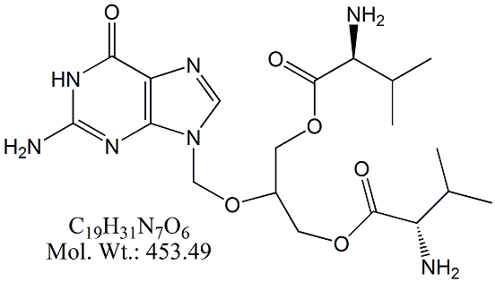 | Valganciclovir USP RC F VGC26-100 Ganciclovir Bis-Valine Ester ; 2-[(2-Amino-1,6-dihydro-6-oxo-9H-purin-9-yl)methoxy]-1,3-bis[(S)-2-amino-3-methylbutyryl]propane ; MORE INFO >> |