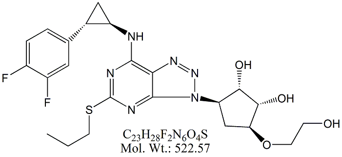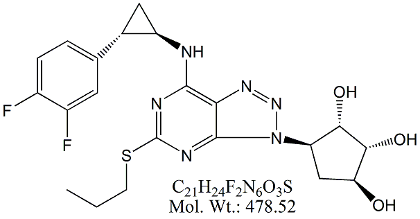 | Ticagrelor TCG00-100 (1S,2S,3R,5S)-3-[7-[(1R,2S)-2-(3,4-Difluorophenyl)cyclopropylamino]-5-(propylsulfanyl)- 3H-[1,2,3]triazolo[4,5-d]pyrimidin-3-yl]-5-(2-hydroxyethoxy) cyclopentane-1,2-diol ; CAS # 274693-27-5 ; MORE INFO >> |