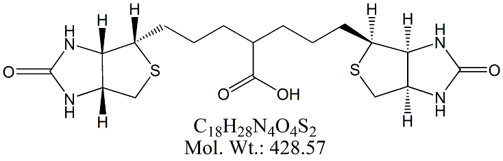 | Biotin EP Impurity A BTN01-100 D-Biotin Dimer Acid ; Di[3-[(3aS,4S,6aR)-2-oxohexahydrothieno[3,4-d]imidazol-4-yl]propyl]acetic acid ; CAS # 1163708-46-0 ; MORE INFO >> |