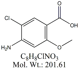 | Metoclopramide EP Impurity C MCA03-100 Metoclopramide BP Impurity C ; 4-Amino-5-chloro-2-methoxybenzoic acid ; CAS # 7206-70-4 ; MORE INFO >> |