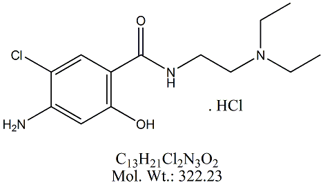 | Metoclopramide HCl MCA00H-100 4-Amino-5-chloro-N-[2-(diethylamino)ethyl]-2-methoxybenzamide hydrochloride ; CAS # 7232-21-5 (anhydrous) ; 54143-57-6 (monohydrate) ; MORE INFO >> |