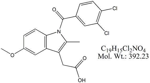 | Indomethacin Impurity G ;  100 MG IDM07-100 Indomethacin 3,4-DiChloro Analog ; [1-(3,4-Dichlorobenzoyl)-5-methoxy-2-methyl-1H-indol-3-yl]acetic Acid ; CAS # 402849-26-7 ; MORE INFO >> |