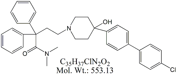 | Loperamide Hydrochloride LPA00H-100 4-[4-(4-Chlorophenyl)-4-hydroxypiperidin-1-yl]-N,N-dimethyl-2,2-diphenylbutanamide hydrochloride ; CAS # 34552-83-5 ; MORE INFO >> |