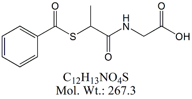| Tiopronin S-Benzoyl Impurity TPN52-100 N-(2-Mercaptopropionyl)-glycine benzoate (ester); N-(α-Benzoylthiopropionyl)glycine ; CAS # 6183-01-3 ; MORE INFO >> |