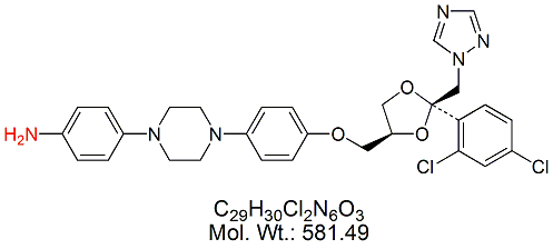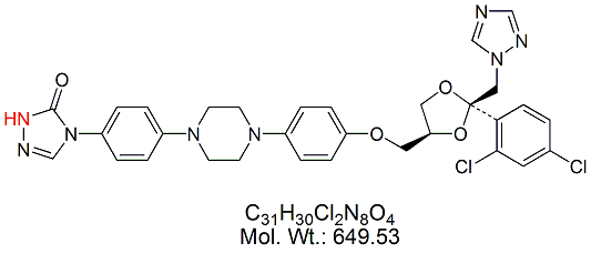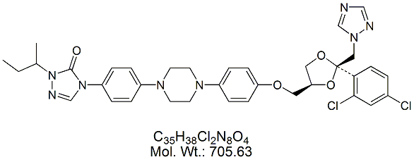 | Itraconazole N-Desalky Impurity ICZ40-100 4-(4-(4-(4-(((2R,4S)-2-((1H-1,2,4-Triazol-1-yl)methyl)-2-(2,4-dichloro phenyl)-1,3-dioxolan-4-yl)methoxy)phenyl)piperazin-1-yl)phenyl)-2H-1,2,4-triazol-3(4H)-one ; CAS # 89848-41-9 ; MORE INFO >> |
