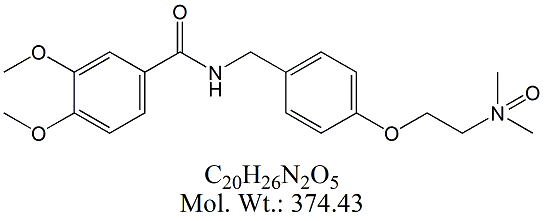 | Itopride N-Oxide ITD52-100 N-[[4-[2-(Dimethyloxidoamino)ethoxy]phenyl]methyl]-3,4-dimethoxybenzamide ; CAS # 141996-98-7 ; MORE INFO >> |