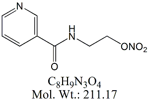 | Nicorandil NCR00-100 N-[2-(Nitrooxy)ethyl]-3-pyridinecarboxamide ; 2-Nicotinamidoethyl nitrate ; CAS # 65141-46-0 ; MORE INFO >> |