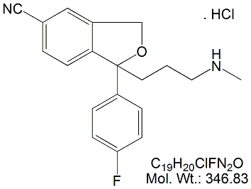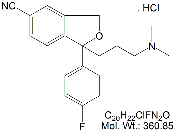 | Citalopram HCl CTL50H-100 1-[3-(Dimethylamino)propyl]-1-(4-fluorophenyl)-1,3-dizohydro-5-isobenzo furancarbonitrile hydrochloride ; CAS # 85118-27-0 ; MORE INFO >> |