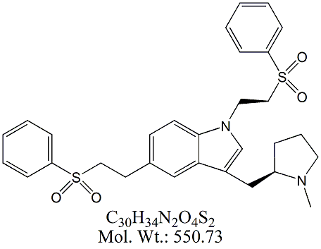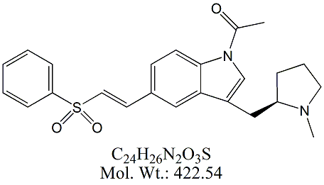 | Eletriptan ETT00-100 3-[[(2R)-1-Methyl-2-pyrrolidinyl]methyl]-5-[2-(phenylsulfonyl)ethyl]-1H-indole ; CAS # 143322-58-1 ; MORE INFO >> |