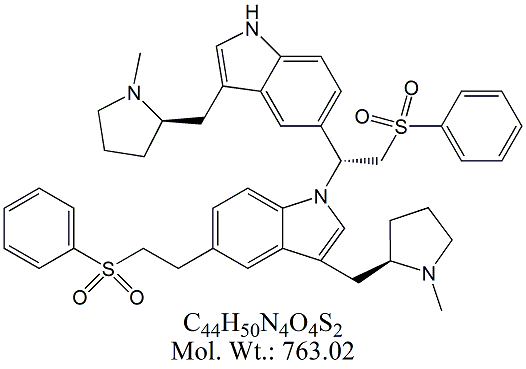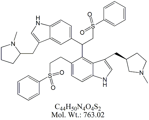 | Eletriptan Impurity H ; 100  MG ETT68-100 Eletriptan Dimer (S)-Isomer ; 3-(((R)-1-Methylpyrrolidin-2-yl)methyl)-1-((S)-1-(3-(((R)-1-methylpyrrolidin-2-yl)methyl)-1H-indol-5-yl)-2-(phenylsulfonyl)ethyl)-5-(2-(phenylsulfonyl)ethyl)-1H-indole ; MORE INFO >> |