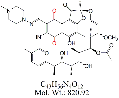 | Rifampicin EP Impurity A RFP01-100 Rifampicin Quinone ; 1,4-Dideoxy-1,4-dihydro-3-[(E)-[(4-methyl-1-piperazinyl)imino]methyl]-1,4-dioxo-rifamycin ; CAS # 13983-13-6 ; MORE INFO >> |