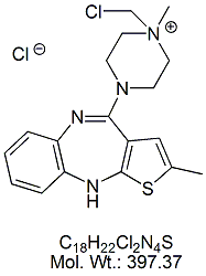 | Olanzapine EP Impurity C OLZ03-100 Olanzapine BP Impurity C ; Olanzapine N-Chloromethyl Chloride ; 1-(Chloromethyl)-1-methyl-4-(2-methyl-10H-thieno[2,3-b]-[1,5]benzodiazepin-4-yl)piperazin-1-ium chloride ; CAS # 719300-59-1 ; MORE INFO >> |