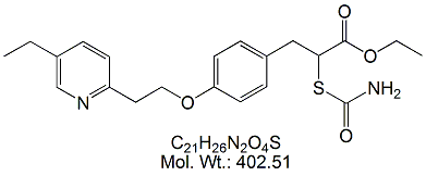 | Pioglitazone EP Impurity D PGT04-100 Ethyl (2RS)-2-(carbamoylsulphanyl)-3-[4-[2-(5-ethylpyridin-2-yl) ethoxy] phenyl] propanoate ; CAS # 868754-41-0 ; MORE INFO >> |
