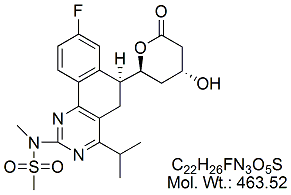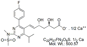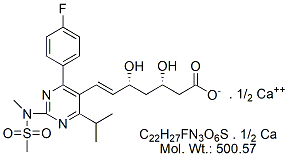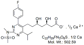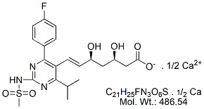| Rosuvastatin Sodium RSV00N-100 (3R,5S,6E)-7-[4-(4-Fluorophenyl)-6-(1-methylethyl)-2-[methyl (methyl sulfonyl) amino]-5-pyrimidinyl]-3,5-dihydroxy- 6-heptenoic acid sodium salt ; CAS # 147098-18-8 ; MORE INFO >> |
