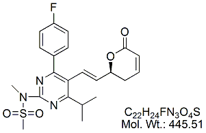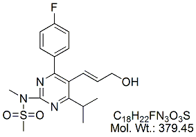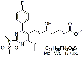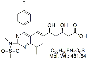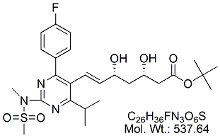 | Rosuvastatin Acid RSV00A-100 (3R,5S,6E)-7-[4-(4-Fluorophenyl)-6-(1-methylethyl)-2-[methyl (methyl sulfonyl) amino]-5-pyrimidinyl]-3,5-dihydroxy- 6-heptenoic acid ; CAS # 287714-41-4 ; MORE INFO >> |
