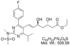 | Rosuvastatin (3S,5S)-Isomer Ethyl Ester RSV75-100 (3S,5S,6E)-7-[4-(4-Fluorophenyl)-6-(1-methylethyl)-2-[methyl(methyl sulfonyl)amino]-5-pyrimidinyl]-3,5-dihydroxy-6-heptenoic acid ethyl ester ; MORE INFO >> |