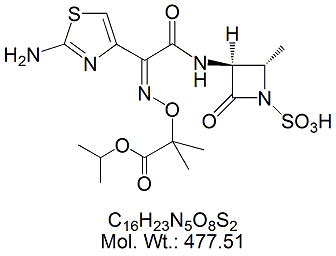 | Aztreonam Isoproppyl Ester AZT45-100 (Z)-2-[[[(2-Amino-4-thiazolyl)[[(2S,3S)-2-methyl-4-oxo-1-sulfo-3-azetidinyl] carbamoyl]methylene]amino]oxy]-2-methylpropionic acid isopropyl ester ; MORE INFO >> |